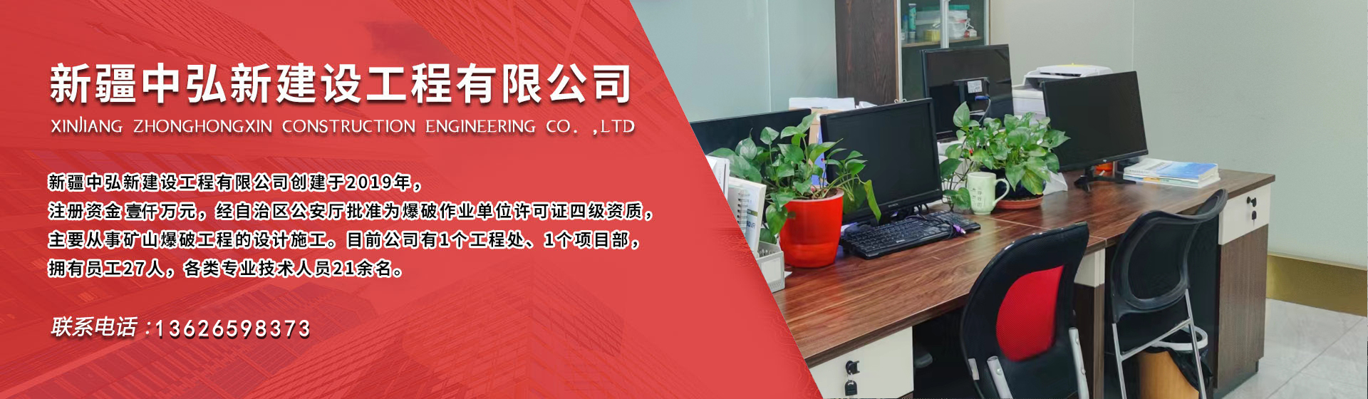 ZHONGHONGXIN CONSTRUCTION ENGINEERING 公 司 簡 介新疆中弘新建設工程有限公司創(chuàng)建于2019年,注冊資金壹仟萬元,經自治區(qū)公安廳批準為爆破作業(yè)單位許可證四級資質,主要從事礦山爆破工程的設計施工、礦上采掘施工業(yè)務。目前公司有1個工程處、2個項目部,分...